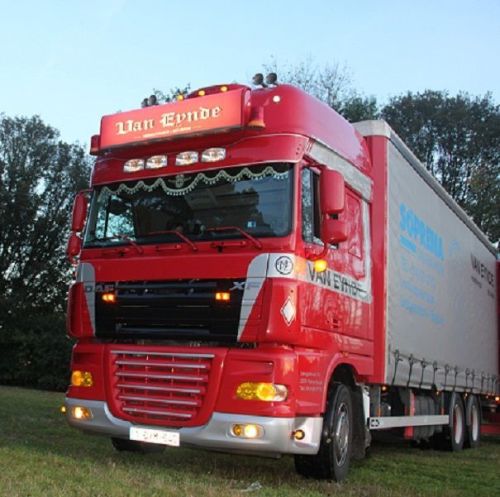 "Pour XF105/106 Super space Cab. Pare-soleil, tout complet, fait en matières de haute qualité avec 4 trous pour Hella 320 (LP pas inclus). Plexi en couleur anthracite et supports en acier, d'abord métallisé suivi par la peinture en poudre. Extra grand, 80mm plus grand que l'original. "