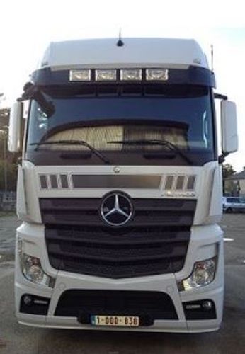"Pour Mercedes MP4 Big/Giga Space / Pare-soleil, tout complet, fait en matières de haute qualité avec 4 trous pour Hella 320FF (LP pas inclus). Plexi en couleur anthracite et supports en acier, d'abord métallisé suivi par la peinture en poudre. Supports pour montage pare-soleil PAS inclus! Montage sur supports d'origine."