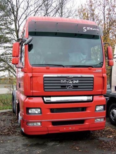 "Pour TGA XXL, cabine large avec toit réhausse. Pare-soleil, tout complet, fait en matières de haute qualité : plexi en couleur anthracite et supports en acier, d'abord métallisé suivi par la peinture en poudre. Le plexi seul peut servir pour remplacer le pare-soleil d'origine. "
