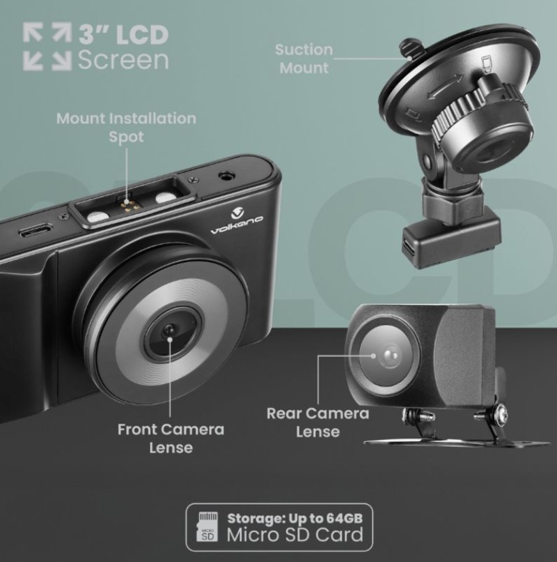 Volkano Camera à bord devant + arrière Trueview 3" 1080p