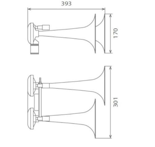 Elektroklep 12V geintegreerd / Minimum druk 6 Bar vereist / 125dB op 2meter / 2Amp / 1x hoge- + 1x lage toon alternerend / L40cm x B30cm x H16cm