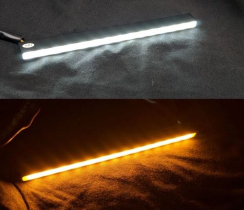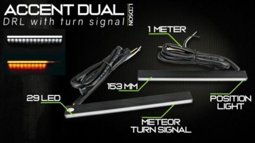 Set van 2 stuks / 12V ! Accent Dual LED Slim combined DRL and running indicator. This means that it has two functions: DRL / position light (xenon white) and running indicator (orange). Running indicator is the same type of indiciator found on eg. newer Audi models. Also called meteor / flowing indicator. Specifications: Dual functions (DRL/flowing indicator) 100% waterproof (IP65) Easily mounted with 3M tape attached Two lights with 29 LEDs each Cable length 100 cm Aluminum casing and epoxy plastic for evenly distributed light Only for 12V (passenger cars)