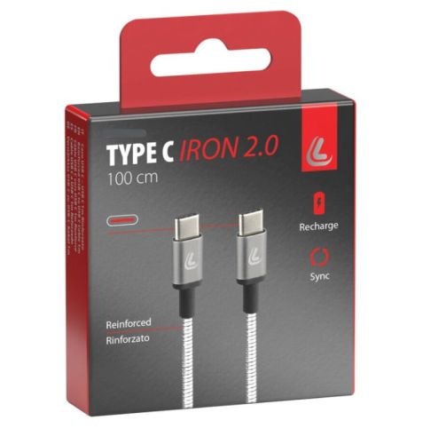 "Iron 2.0, kabel USB Type-C > USB Type-C - 100 cm Oplaad- en datakabel. Compatibel met supersnel opladen (3000 mA / 60 W). Metalen versteviging ter bescherming van de kabel en ter vermindering van slijtage. Metalen frame, versterkte hals en kabel."
