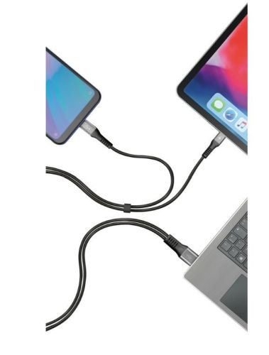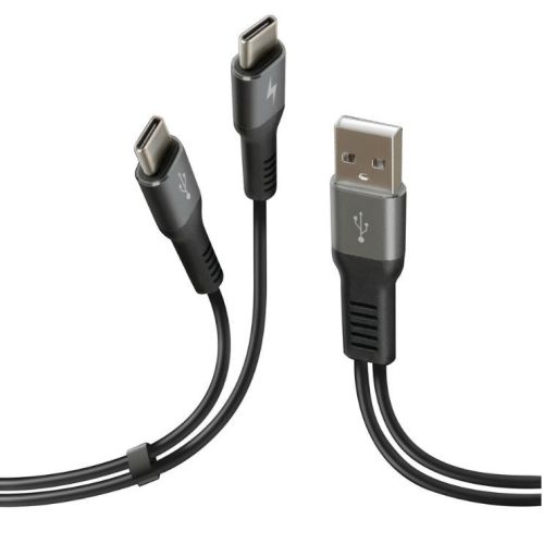 "• Kabel met dubbele connector, Usb> Type-C - 100 cm - Zwart • Opladen en data. • Laad tegelijkertijd 2 apparaten op. • Compatibel met supersnel opladen. • Metalen frame, verstevigde hals"