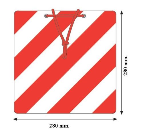 "28cm x 28cm x 1mm / Retroreflekterend / met 2 gaten + koord / Per stuk geleverd. Ingevolge een wetswijziging (Belgisch Staatsblad 09/09/2013 : Wijzigingen aan het Koninklijk besluit van 2 juni 2010 betreffende het wegverkeer van uitzonderlijke voertuigen), zijn de eigenschappen waaraan het paneel voor uitstekende ladingen (Om de lading die meer dan één meter buiten het achtereinde van het voertuig uitsteekt te signaleren) moet voldoen, gewijzigd. De retro-reflecterende rode en witte strepen voldoen aan de fotometrische en colorimetrische voorschriften van de internationale normen, zijnde retro-reflecterende strepen van van type 3 klasse C van Reglement nr.104"