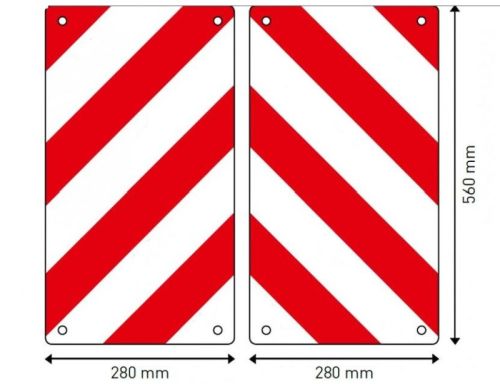 Panelen voor uitzonderlijk vervoer & landbouwvoertuigen / 28cm x 56cm / Set van 2 stuks (links + rechts) / Witte én rode strepen zijn retroreflecterend. Op elk paneel moet ten minste één van de retroreflecterende strepen voorzien zijn van een markering. Deze panelen voldoen aan de wettelijke normen (RA2 van de norm NBN EN 12899-1)