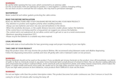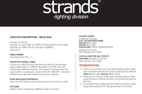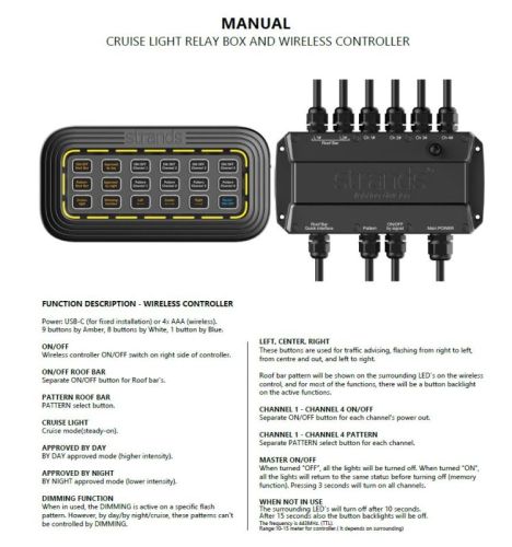 "• 10-35V gelijkstroom • IP67 • Zwarte behuizing • EMC ECE R10 De Cruise light draadloze controller is de eerste die alle voertuigverlichting regelt met één druk op de knop. U krijgt uitstekende functies om uw rijervaring naar een hoger niveau te tillen. Voor elke bestuurder elke dag. De Cruise Light draadloze controller past op alle voertuigen en kan alle voertuigverlichting aansturen. Het is allemaal mogelijk door de meegeleverde relaisbox, met zes verschillende uitgangskanalen, in totaal 700W. 2x 150W (15A) bedoeld voor de Cruise Light Roof bars en 4x 100W (10A) voor elk type voertuigverlichting. De uitgangskanalen kunnen worden aangestuurd met de draadloze bediening of de signaalkabel. Gebruik de controller draadloos met batterijen (4x AAA, niet inbegrepen), of plaats hem ergens in je cabine en sluit de controller aan met de meegeleverde USB-kabel. De relaiskast is bestand tegen ruwe omgevingen, is waterdicht, heeft een IP-classificatie volgens IP67 en de rubberen pakkingen beschermen de kabels. De draadloze controller is kleurgecoördineerd. Negen knoppen zijn oranje, acht zijn wit en één is blauw. De amberkleurige knoppen zijn bedoeld voor de Cruise Light-dakstangen en kunnen de balkfuncties bedienen, zoals het wijzigen van de patronen of het in- en uitschakelen ervan. Voor de meeste functies wordt de knop gemarkeerd op de actieve functies en worden de dakbalkpatronen ook weergegeven op de omliggende LED's. Je krijgt ook knoppen voor goedkeuring door dagmodus, nachtmodus en cruiselichtmodus. De drie knoppen, links, midden en rechts, worden gebruikt voor verkeersadvisering, knipperend van rechts naar links, van het midden naar buiten en van links naar rechts. De blauwe knop zet alle aangesloten verlichting aan en uit, en de lampen keren terug naar dezelfde status voordat ze uitgaan met behulp van de ingebouwde geheugenfunctie. Als u drie seconden drukt, worden alle kanalen ingeschakeld. Wil je alle verlichting aansturen met de relaiskast, gebruik dan de signaalkabel. De signaalkabel maakt het mogelijk om bijvoorbeeld de achteruitrijlamp op één van de vier kanalen aan te sluiten en met de draadloze bediening als werklamp te gebruiken. Het wordt een dubbele functie. Door de Cruise Light draadloze controller en de meegeleverde relaisbox te gebruiken, ben je altijd klaar om je passie zichtbaar te maken en je rijervaring naar een hoger niveau te tillen. Voor elke bestuurder elke dag. De Cruise Light-controller en de meegeleverde relaisbox maken het eenvoudiger om alle functies van de Cruise Light Roof bars te bedienen, bijvoorbeeld het wijzigen van patronen of het in- en uitschakelen van de bar. Alle amberkleurige knoppen zijn gecoördineerd met de functies van de Cruise Light dakdragers en de patronen worden weergegeven op de omringende LED's. Je krijgt ook knoppen voor goedkeuring door dagmodus, nachtmodus en cruiselichtmodus. Gebruik de controller draadloos met batterijen (4x AAA, niet inbegrepen). Dit maakt het gemakkelijker als u rond of in de buurt van het voertuig werkt en de straalpatronen van buitenaf moet wijzigen. Je kunt hem ook ergens in je cabine plaatsen of de controller aansluiten op de meegeleverde USB-kabel. De controller past op alle voertuigen en kan alle soorten voertuigverlichting aansturen. Het is allemaal mogelijk door de meegeleverde relaisbox en de vier uitgangskanalen met elk 100 W (10A). De relaiskast is bestand tegen ruwe omgevingen, is waterdicht, heeft een IP-classificatie volgens IP67 en de rubberen pakkingen beschermen de kabels. "