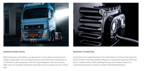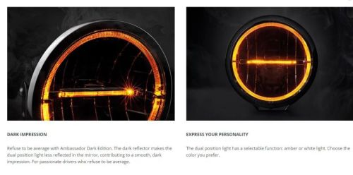"Weiger gemiddeld te zijn met Ambassador Dark Edition. Een uniek en buitengewoon rijlicht, dat garant staat voor hoge kwaliteit met donkere componenten. Ambassador Dark Edition is ontwikkeld voor u die uw voertuig een exclusieve, donkere look wil geven met een kwaliteit die aan hoge verwachtingen voldoet. De donkere reflector maakt het dubbele positielicht wordt minder gereflecteerd in de spiegel, wat bijdraagt ??aan een gladde, donkere indruk. Het dubbele positielicht wordt geleverd met een selecteerbare functie. Kies tussen amber of wit licht. Met Ambassador Dark Edition krijg je passie in elk detail. Alles van ontwerp tot toepassing. De montageaccessoires worden geleverd met zwarte componenten om bij te dragen aan een donkere indruk. De trim/ring is ontworpen in twee verschillende kleuren. Kies tussen zwart en chroom. Beide kleuren zijn inbegrepen. Kies degene die het beste bij uw passie en uw voertuig past. – DONKERE IMPRESSIE - DRUK JE PERSOONLIJKHEID UIT – PASSIE IN ELK DETAIL Type of lamp LED Type of LED EDISON PCS LED´s 8 Voltage (V DC) 12-24V DC Consumption (w) 12V High beam: 67W Position light: 25W Consumption (w) 24V High beam: 67W Position light: 25W Consumption specific function (w) 12V High beam: 67W Position light: 25W Consumption specific function (w) 24V High beam: 67W Position light: 25W Theoretical lumen 5535 Actual lumen 1948 1 LUX @ m 381 Kelvin 6000 IP-class 66/68 Colour housing Black Colour lens Clear Colour LED´s White and amber Beam pattern Spot Position light Yes white and amber Connection Cable Cable length (mm) 3000 Material bracket Stainless steel Material housing/chassi Aluminium Material lens Polycarbonate Depth (mm) 132 Height including bracket (mm) 245 Diameter (mm) 230.5 Operating temperature -40°C – +40°C ADR-approved No E-approved No EMC ECE R10"