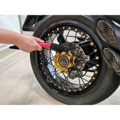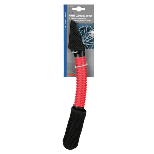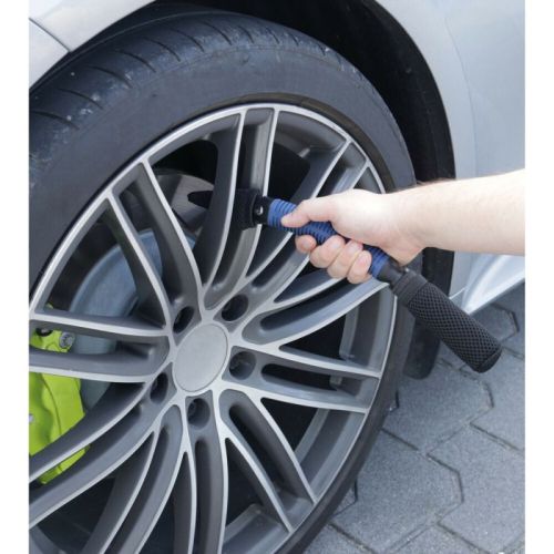 "Specifiek voor het reinigen van velgen, bouten en andere moeilijk bereikbare delen van de wielen. Kunststof handgreep met rubberen coating en borstel met microvezel kap om krassen op de velgen te voorkomen. Wasbare en herbruikbare doek. Afmeting: 32,5 cm"