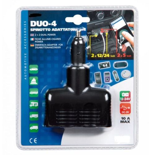 "10A max. 2 x 12 / 24V aanstekers, 2 x USB-aansluiting (2A max) voor mp3-spelers, pda, telefoons, gps, etc. Verstelbare hoek (0-30-60-90 °)"