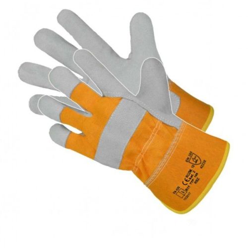 "SET VAN 12 PAAR HANDSCHOENEN Vijfvingerige leren en stoffen beschermende handschoenen, volledige handpalm: het gripgedeelte is gemaakt van zeer goede kwaliteit rundsplitleer in een natuurlijke kleur, zorgt voor een goede grip op vastgehouden voorwerpen, het achterste gedeelte is gemaakt van gele denimstof, met een aantrekband boven de manchet genaaid, het achterste gedeelte is versterkt met hetzelfde leer langs de lijn van de middenhandsbeentjes en de vingertoppen, rubberen denim manchet met bies binnenkant van het grijpgedeelte afgewerkt met een dikke en zachte voering, Beschermingsparameters volgens EN 388: slijtvastheid 4, snijweerstand 2, scheurweerstand 2, lekweerstand 3. CE-kat. 2 EN 388:2016 (4.2.2.3), EN 420:2003+A1:2009"