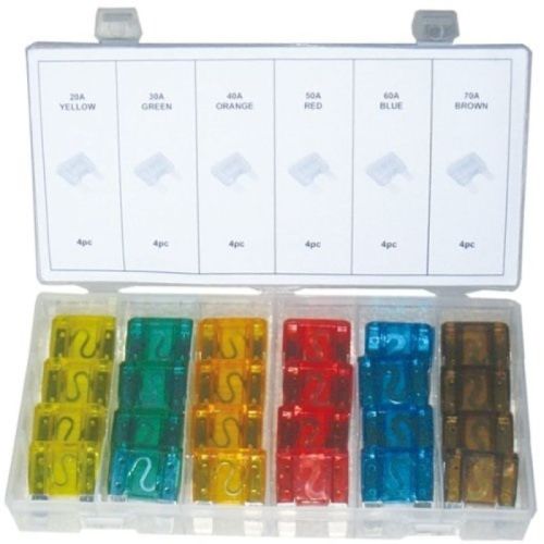 Assortiment maxi zekeringen 24 delig Gevuld met diverse soorten Maxi steekzekeringen van 20 t/m 70 Ampère. Inhoud: 20 AMP (4 st.) 30 AMP (4 st.) 40 AMP (4 st.) 50 AMP (4 st.) 60 AMP (4 st.) 70 AMP (4 st.)