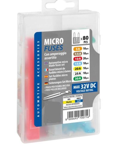 "Set 80 geassorteerde microbladzekeringen, 12/32V Met zekeringtrekker. 10 x 5A - 10 x 7,5A - 20 x 10A - 10 x 15A - 10 x 20A - 10 x 25A - 10 x 30A"
