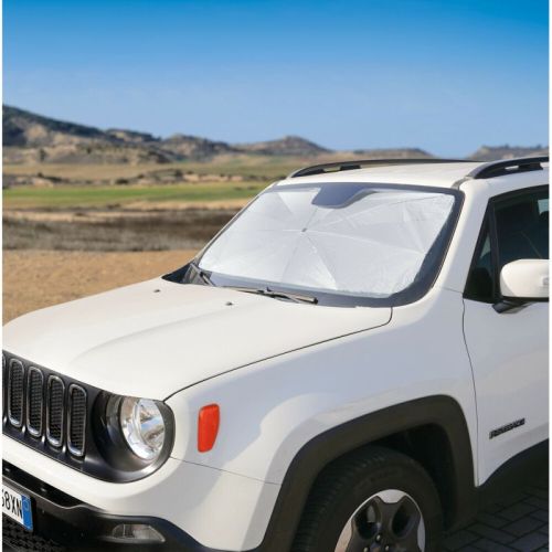 "Met glasvezelribben Verstelbare roestvrijstalen handgreep Opening voor achteruitkijkspiegel Compact en lichtgewicht ontwerp voor eenvoudig transport Effectieve bescherming tegen hitte en uv-straling Duurzame, hoogwaardige materialen (190T + titanium zilvercoating) Beschermhoes inbegrepen"