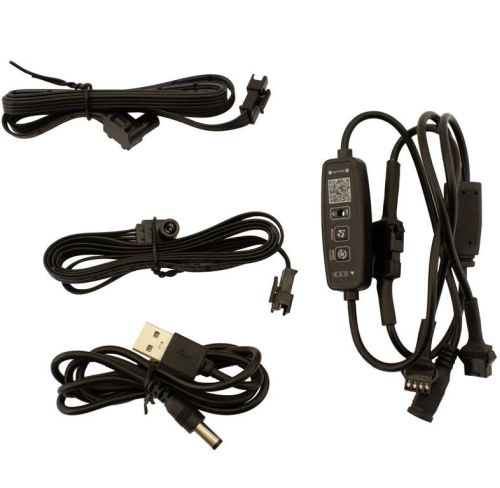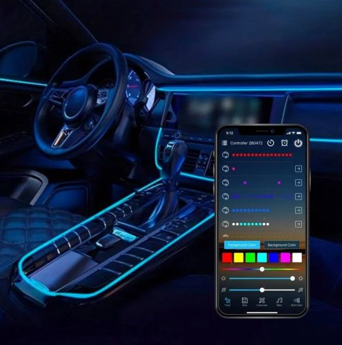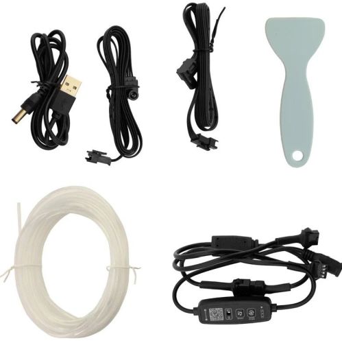 "Éclairage d'ambiance intérieur LED multicolore en 2 parties avec contrôle par application et fibre optique de 5 mètres 12 V Éclairage intérieur universel à LED multicolores avec 2 LED haute puissance et 5 mètres de fibre optique. Idéal pour ajouter un éclairage d'ambiance à votre tableau de bord ou 2 portes. Grâce à la connexion USB, cet ensemble peut facilement être connecté à une connexion USB existante dans votre voiture, ou via un adaptateur de charge USB dans l'allume-cigare. Les LED peuvent être commandées via le contrôleur intégré ou via l'application téléchargeable (scannez le code QR sur le contrôleur) sur votre smartphone et sont équipées de différents motifs de couleurs et effets de lumière."
