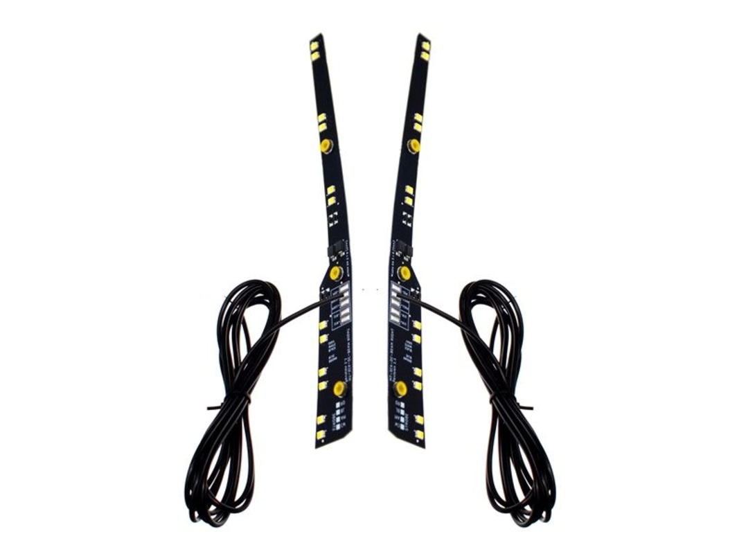 "Modelle Scania 2016->2022 Projecteurs LED puissants pour feux de position additionnels, montés sous le pare-brise des Scania +2016. ORANGE Chaque émetteur est équipé d'un câble de 3 mètres, à raccorder aux feux de position d'origine. Il comporte un fil positif et un fil négatif. Chaque panneau est également équipé d'un câble de 3 mètres, avec un fil positif et un fil négatif."