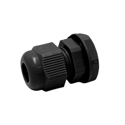 Black cable gland PG 9 for cables from 4-8mm. Specifications: • Thread type: PG 9 • Outer diameter: 14.3mm • Pitch: 1.5 • Inner diameter: 9.9mm • Wrench width: 7mm • Thread length: 8.1mm • Total length: 15.2mm • Cable range: 4-8mm • Color: Black • Material: Nylon 66 • Approval: UL 94V-2 • IP68
