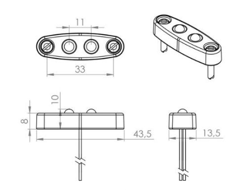"This is an extra small LED lamp with 2 powerful LEDs. The lamp is potted, so it is completely waterproof. It can be mounted both indoors and outdoors, on both cars and trucks. The lamp has a built-in voltage regulator, so it can be connected to both 10V and 30V. The measurements of the lamp are only 43mm x 13mm x 8mm. The mounting holes in the lamp are 3.5mm and they have a distance of 33mm. The lamp is mounted with 3mm screws. The holes are recessed, so the lamp has a flat surface when mounted. There is a 50cm red wire and a black wire that comes out of the back, which are connected to respectively plus and minus. •consumption: 0,24 Watt •Width 13mm •Height 8 mm •Length 43 mm Dimensions Width 13.0 mm Height 8.0 mm Length 43.0 mm "