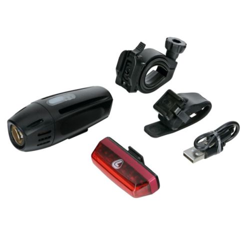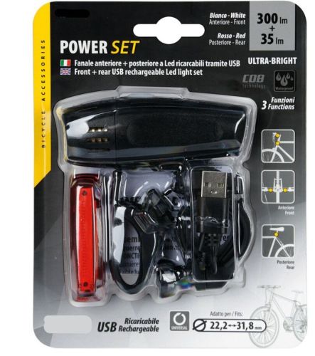 "Power, USB oplaadbare LED-verlichtingsset voor en achter Witte voorlamp van 300 lm Rood achterlicht van 35 lm 3 functies: continu licht, middenstand, knipperlicht Energiezuinige LED COB van de nieuwste generatie Universele montage, geschikt voor sturen en frames van Ø 22,2 tot 31,8 mm Montagebeugels met snelkoppelsysteem Inclusief Li-ion batterijen Gemiddelde brandduur bij continu gebruik: 2 uur (middenstand) Oplaadtijd: 2,5 uur"