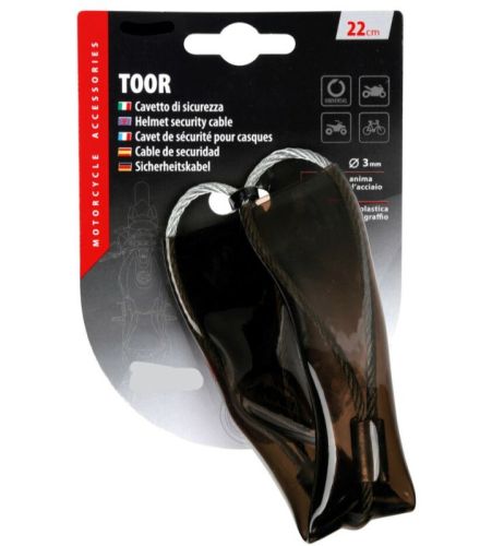 "Toor, helmbeveiligingskabel - 27,5 cm Geschikt voor alle motoren met een helmhaak onder het zadel. Krasbestendige kunststof hoes Ø 3 mm stalen kernkabel"