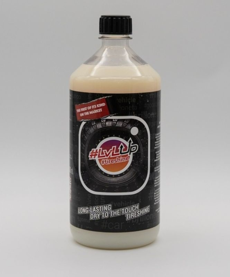 "#LvLUp is een bandendressing die uw banden tot leven brengt. Na het aanbrengen van dit product blijven uw banden langdurig in een zwarte wetlook, bieden ze bescherming tegen UV-schade en heeft u altijd het gevoel alsof u een paar gloednieuwe glimmende schoenen draagt. Eén toepassing van #LvLUp Tireshine gaat minstens een maand mee door regen en verschillende wasbeurten !!! Met 1000 ml kun je minimaal 50/60 keer het product aanbrengen op je autobanden (afhankelijk van de maat van de banden) en minimaal 6 keer op een vrachtwagen en aanhanger (10 vrachtwagenwielen x 6 keer) In de doos vind je: • Een flesje van 1000 ml #LVLUp"