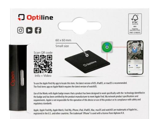 "Ontworpen om naadloos samen te werken met de “Find My”-app van Apple. Dit ultradunne en compacte apparaat is de perfecte oplossing voor het bewaken van items en het bieden van discrete bescherming. Ultradun ontwerp: met zijn slanke profiel past de tracker gemakkelijk in elke omgeving zonder ruimte in beslag te nemen. Compact en gemakkelijk te verbergen: dankzij het kleine formaat kan hij gemakkelijk in tassen, portemonnees, zakken en jassen worden geplaatst. Veelzijdig: kan worden gebruikt als eenvoudig bewakingsapparaat of als beschermingsmiddel voor verschillende objecten. Kleeftoepassing: met de geïntegreerde lijm kan hij worden bevestigd aan motorfietsen, fietsen, helmen, laptops, gereedschap en vele andere voorwerpen, waardoor een uitstekende veiligheid wordt gegarandeerd. Afmeting: 60x60x3 mm Vereenvoudigt het terugvinden van verloren voorwerpen via de 'Vind Mijn'-app. Dankzij de eenvoudige configuratie via de app maakt OptiTag snel verbinding met uw apparaat. In de verpakking vindt u het apparaat en een handige siliconen taghouder. Om een object te lokaliseren, kunt u de ingebouwde luidspreker laten rinkelen of Siri om hulp vragen. Compatibel met een breed scala aan Apple-apparaten. Hoe werkt OptiTag? OptiTag maakt gebruik van Apple's uitgebreide netwerk van aangesloten apparaten met de "Find My"-service om uw object waar ook ter wereld te lokaliseren. Activeer de ingebouwde luidspreker van uw OptiTag of vraag Siri om hulp om deze op te sporen. Bent u op zoek naar uw sleutels en kunt u deze niet vinden, dan heeft OptiTag de oplossing. Ga naar het gedeelte 'Items' van de app 'Vind mijn' en laat de ingebouwde luidspreker in de OptiTag overgaan. Of vraag Siri: "Hé Siri, zoek mijn huissleutels." Als ze in de buurt zijn, volg je gewoon het geluid om ze te vinden. Verloren modus Als de audio-optie niet voldoende is, kunt u de "Lost Mode" activeren. Zo ontvang je een melding zodra jouw OptiTag wordt gedetecteerd door een ander apparaat op het netwerk. Via een eenvoudige begeleide procedure kunt u ook een telefoonnummer aan uw OptiTag koppelen, zodat degene die het nummer vindt gemakkelijk contact met u kan opnemen. Door deze stappen te volgen, kan iedereen die de OptiTag vindt, deze dichtbij zijn apparaat met een NFC-module brengen en een bericht weergeven met uw telefoonnummer. Om deze modus te activeren, opent u de applicatie "Zoek mijn", gaat u naar het itemgedeelte en selecteert u de verloren tag. Onder de beschikbare opties vindt u de Lost Mode, die de hierboven beschreven procedure activeert. OptiTag zorgt voor maximale veiligheid en privacy: de communicatie vindt anoniem en gecodeerd plaats, waardoor uw gegevens en uw locatie worden beschermd. Compatibiliteit OptiTag is compatibel met een breed scala aan Apple-apparaten, waaronder iPhone SE*, iPhone 6s* en latere modellen, iPod touch* van de zevende generatie met iOS 14.5* of hoger, evenals iPad Pro*, iPad* van de vijfde generatie en hoger modellen, iPad Air 2* en latere modellen, iPad mini 4* en latere modellen met iPadOS 14.5* of hoger. OptiTag is ook compatibel met AirTag*-accessoires"
